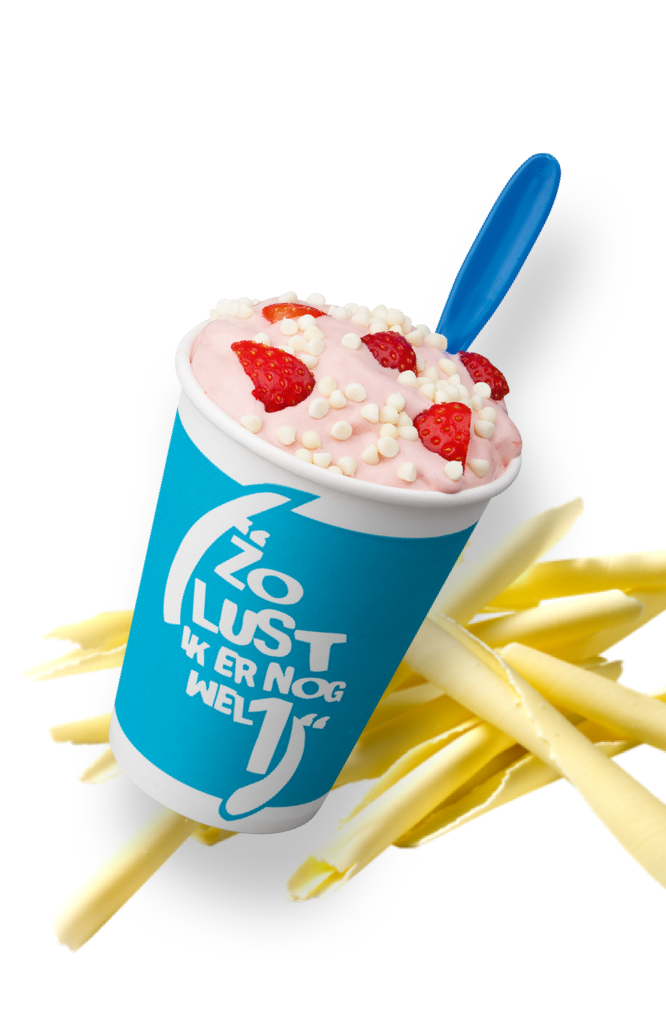 Overheerlijk softijs gecombineerd met een compound van aardbei, verse aardbei en witte chocolade stukjes maakt van deze ijstornado een frisse smaaksensatie!